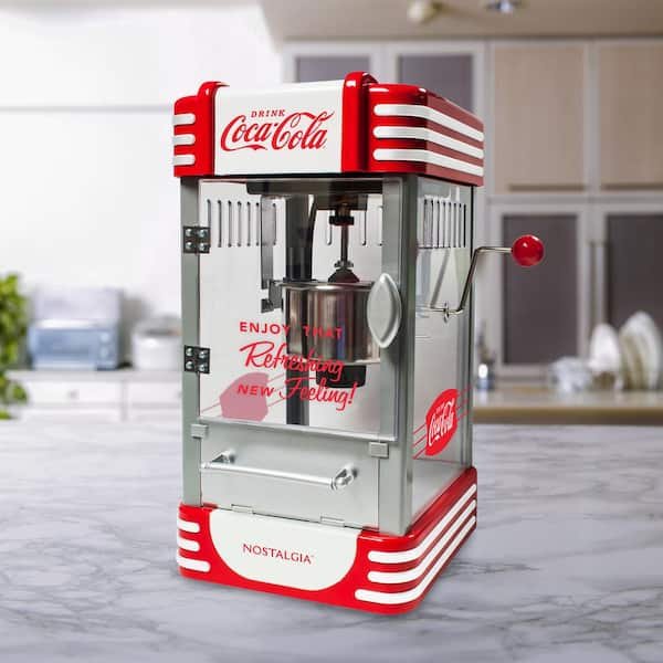 With its unique vintage style and ease of use, this Nostalgia popcorn maker RKP730CK cart will be the hit of every party Featuring a large 2.5oz. stainless steel kettle with a built-in stirring system, can pop up to 10 cups of popcorn per batch. The vented windows and lighted interior allow you to watch the popcorn popping so you know right when to empty the kettle and the tilt door allows for easy serving access. It includes an oil measuring spoon and kernel measuring cup to ensure a perfectly popped popcorn every time. Popcorn has never tasted so good at home.