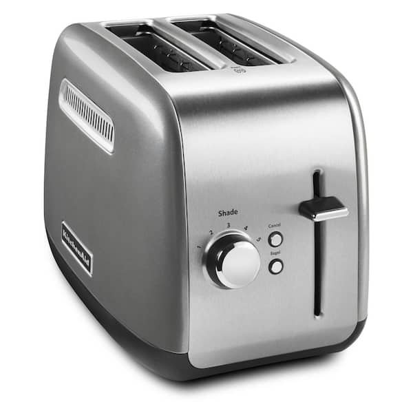 KitchenAid’s KMT2115 2-Slice Toaster has chrome buttons that glow with blue back-light illumination when in use. The extra-wide slots will accept the thickest bagels, breads, or pastries and the extra-deep, steel toasting cavity ensures even browning. The racks automatically adjust the slot width for thick or thin slices, keeping food upright for even toasting. When your food is ready, the manual high lift lever makes it easy to get it out of the toaster. Selecting the bagel toasting function reduces the power on one side of the heating elements by 50% to produce a better toasted bagel. Plus, the adjustable 5-shade setting ensures your food will pop up just the way you like it.