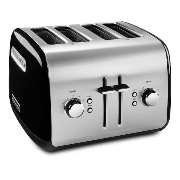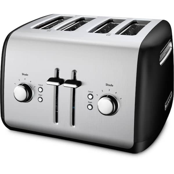 KitchenAid’s KMT4115 4-Slice Toaster has chrome buttons that glow with blue back-light illumination when in use. The extra-wide slots will accept the thickest bagels, breads, or pastries and the extra-deep, steel toasting cavity ensures even browning. The racks automatically adjust the slot width for thick or thin slices, keeping food upright for even toasting. When your food is ready, the manual high lift lever makes it easy to get it out of the toaster. Selecting the bagel toasting function reduces the power on one side of the heating elements by 50% to produce a better toasted bagel. Plus, the adjustable 5-shade setting ensures your food will pop up just the way you like it.