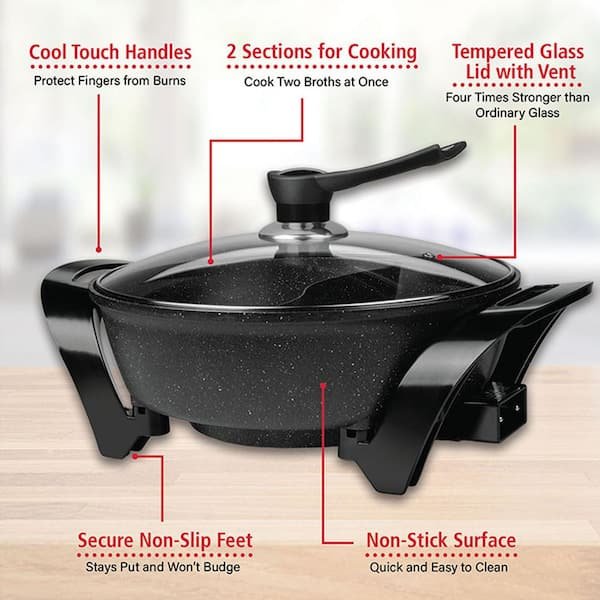 The powerfull Brentwood Shabu Shabu Pot with Divider is perfect for making authentic Japanese cuisine at home. It features a convenient 2-section design with a non stick surface for easy clean up. Cook 2-sides or soups at once and save time and dishes with this hot pot. Cool touch handles makes this pot easy to use while cooking and rubber feet keep it secure and in place. Removable thermostat with adjustable temperature up to 430 Degrees Fahrenheit.
