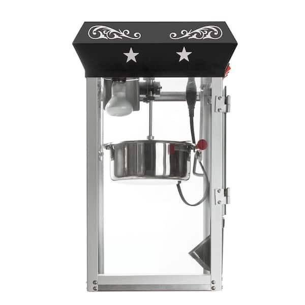 Offering nostalgic charm with a retro-style design, this premium-quality popcorn machine is equipped with completely modernized features for convenient, easy operation and lasting functionality. Ideal for adding novelty at school and church fundraisers and carnivals, businesses, parties, little league, and varsity games, home movie theatres, and much more, this 10 oz. kettle can produce about 4 gal. of popcorn per batch to satisfy large crowds. Makes a great gift for movie buffs. Constructed of highly durable materials including heavy-duty powder coated steel and stainless steel food zones, tempered safety glass walls, vibrant, richly pigmented premium paint, and a powerful, commercial-quality motor, this deluxe popcorn machine is built to last. Convenient 3-switch operation includes a spot light warmer, stirrer, and pot heater. The machine includes a warming deck and heat light to keep popcorn fresh and delicious, as well as a drawer to catch any un-popped kernels for a perfect batch every time. Cleans easily with water, and runs on a US-standard 120 volt power cord for quick and easy setup almost anywhere. Includes: Olde Midway Popcorn Machine with 10 oz. Kettle 50-Popcorn Bags Stainless Steel Popcorn Accessories: 1/2 cup Measuring Cup, Tablespoon, Popcorn Scoop, and Salt Shaker Minor assembly is required. Olde Midway is well-known within the industry for finely crafted, specialty appliances that combine stylish design with exceptional durability at a great value.