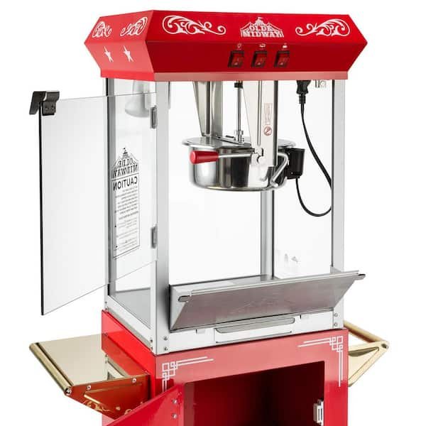 Offering nostalgic charm with a retro design, this popcorn machine is equipped with completely modernized features for convenient, easy operation and lasting functionality. This 10-ounce kettle can produce about 4 gal. of popcorn per batch to satisfy large crowds. Also makes a great gift for movie buffs. Constructed of highly durable materials including heavy-duty powder coated steel and stainless steel food zones, tempered safety glass walls, vibrant, richly pigmented paint, and a powerful but whisper-quiet motor, this deluxe popcorn machine is built to last. Heavy-duty cart with high-quality hinges and handles provides convenient storage space for popcorn and accessories and is easily portable with its large 16 in. bicycle-style, ball-bearing wheels. Durable welded legs with rubber-capped feet provide stability on all types of floors, as well as protect floors from scuff marks. 3-switch operation includes a spotlight warmer, stirrer, and pot heater. The machine includes a warming deck and heat light to keep popcorn fresh and delicious, as well as an old maid drawer to catch any un-popped kernels. Cleans easily with water, and runs on a US-standard 120 volt power cord for quick and easy setup almost anywhere. Includes: Olde Midway Popcorn Machine with Cart and 10 oz. Kettle 50-Popcorn Bags Stainless Steel Accessories: 1/2 cup Measuring Cup, Tablespoon, Popcorn Scoop, and Salt Shaker Minor assembly is required.
