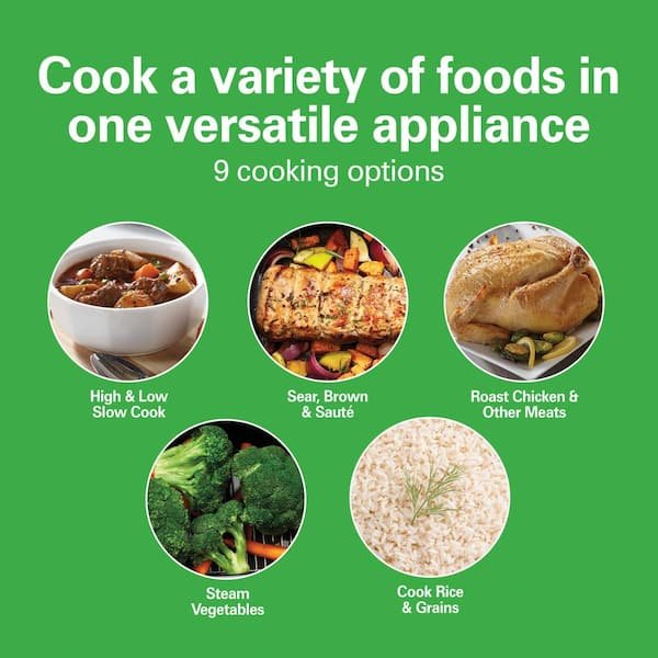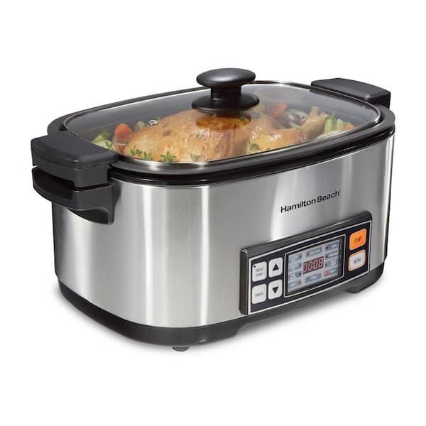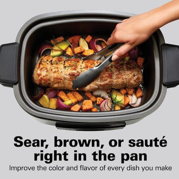 Enjoy complete cooking flexibility and save storage space with the Hamilton Beach Multi Cooker. With a 6 Qt. capacity large enough to feed the whole family, it combines the functions of a slow cooker, roaster, rice cooker, food steamer and more. Slow Cook on Low and High Low and high settings with steady and gradual heat offer the same results as a traditional standalone slow cooker. Roast Chicken and Other Meats Roast chicken, beef, turkey and ham to perfect tenderness in about 3 hours. The included roasting rack ensures your food is cooked evenly throughout. Cook Rice and Grains Make a quick side of white rice or a hearty risotto with the rice and grains settings. Steam Setting The steam function makes it simple to prepare healthier food options, like seafood, poultry or vegetables. Sear, Brown and Saute The sear/brown and saute settings are especially useful for improving the flavor and color of your food before using the slow cook or roast functions. Extra Features Keep Warm, a countdown timer and delay start feature for certain settings add to this multi cookers convenience. Large 6 Qt. Capacity Rectangular cookware can fit a whole 6 lbs. chicken or 4 lbs. roast. Easy to clean removable non-stick cookware and roasting/steaming rack are dishwasher safe.