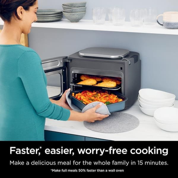 [This review was collected as part of a promotion.] I am very excited to try this Ninja Combi appliance today! It is slightly smaller than a microwave but it has many more functions than a regular microwave. You can bake and cook at the same time. It has several functions like an oven and air fryer all in one kitchen appliance. I love that it has two different ways to cook, a top rack like a cookie sheet and a bottom pan that is deeper for baking. I only deducted one star because I wish it wasn’t all nonstick, but other than that it is very worth it! I am gifting one to our newly married friends.