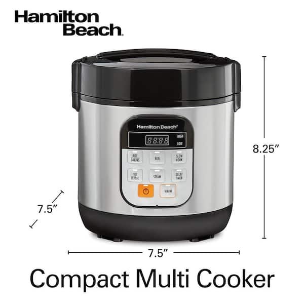 Save storage space while enjoying complete cooking flexibility with the Hamilton Beach Compact Multi Cooker. Combining the functions of a rice cooker, egg cooker, slow cooker, steamer and more, this multi cooker is perfect for making a variety of dishes in a single pot. The 1.5 qt. capacity is perfect for making enough for 1-2 people and for kitchens where space is limited. An egg/steaming tray, rice paddle and measuring cup are included.