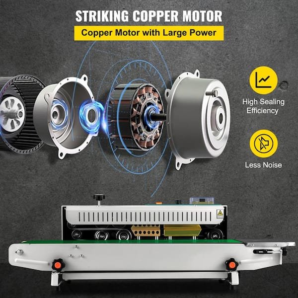 Auto Horizontal Continuous Bag Sealing Machine. Automatic, Powerful and Considerate. The VEVOR horizontal bag sealer features an electronic constant temperature mechanism and stepless speed adjusting. It can seal plastic film or bags of various materials in various shapes. You can print the production date, logo, etc., on the package simultaneously. Due to the different thicknesses of the bag, it is recommended that the temperature and pressure be appropriately adjusted.