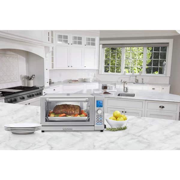 The Cuisinart Deluxe Convection Toaster Oven Broiler is designed with 9 functions, including convection for making delicious cakes, potatoes and roasts. Sized to accommodate a whole chicken, a 12 in. pizza or 6 slices of bread, the unit is controlled by an electronic dial and LED buttons. The large blue back-lit LCD allows for the quick and easy setting of function, temperature and cook time. The Exact Heat sensor maintains precise oven temperatures and the Always Even shade control ensures that toast consistently turns out the selected shade.