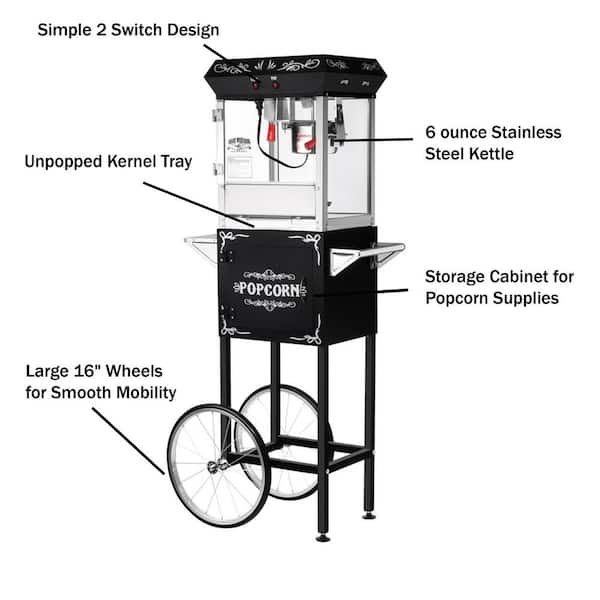 Foundation Popcorn Machine with Cart- Popper Makes 2 Gallons- 6-Ounce Kettle, Old Maids Drawer, Warming Tray & Scoop