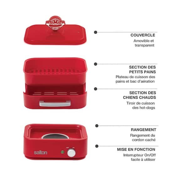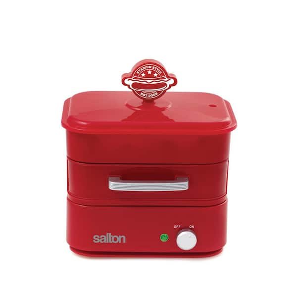 Nothing beats an authentically-steamed stadium-style hot dog. The Salton Hot Dog Steamer fits regular or jumbo sized hot dogs and buns and steams in under 5 minutes! Equipped with a hot dog steaming drawer and a bun steaming tray to easily steam hot dogs and buns at the same time. Easy to clean and store with completely detachable parts and handy cord storage. Just add water – the removable and transparent lid ensures the right amount of water for the perfect steam every time.