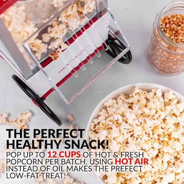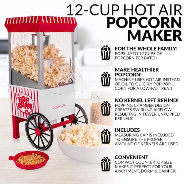 This wonderfully designed replica of the old-fashioned, street-corner popcorn stands of the early 1900s and is a table-top sized party pleaser. In just minutes, family and friends can enjoy the taste of freshly popped popcorn. Its electric popping system uses hot air instead of oil, producing a light and healthy snack. This popcorn maker comes with a measuring cap that assures the proper amount of kernels are used in each batch. Enjoy the fresh taste of hot popcorn in minutes.