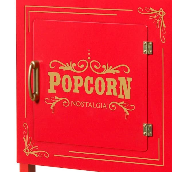 Modeled after the antique popcorn carts of the early 1900s, this beauty features a 10 oz. kettle with built-in stirring system, and pops the most delectable batches of popcorn time and time again. The tempered glass door and windows with lighted interior let everyone view each kernel being popped. Keep supplies on hand in the convenient storage compartment located in the base. If space is an issue the top is removable and becomes a countertop unit.
